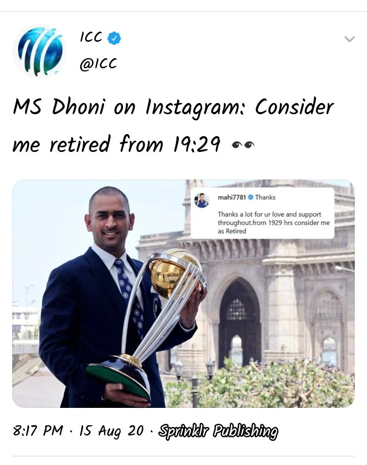 बताते चले कि धोनी ने अपना आखिरी अंतराष्ट्रीय मुकाबला विश्व कप के सेमीफाइनल मुक़ाबले में जुलाई 2019 को खेला था जिसके बाद से धोनी ने एक भी मुकाबला नहीं खेला है और 15 अगस्त को उन्होंने अंतराष्ट्रीय क्रिकेट से संन्यास भी ले लिया था।