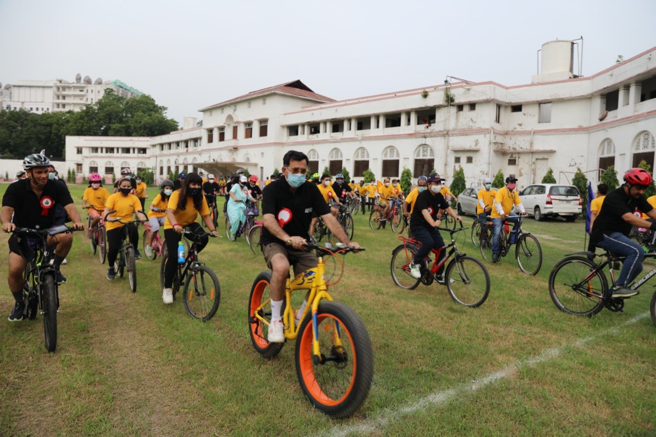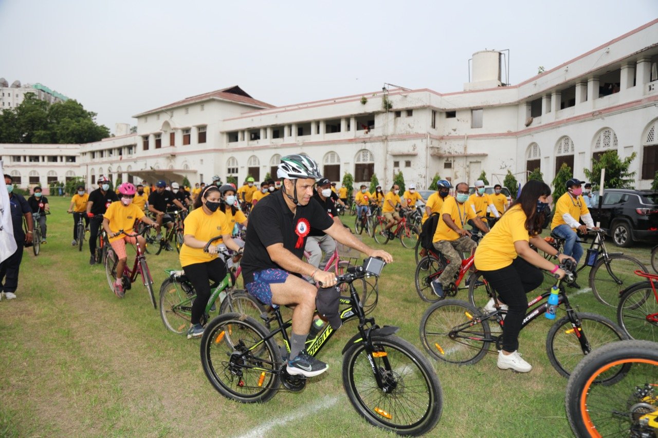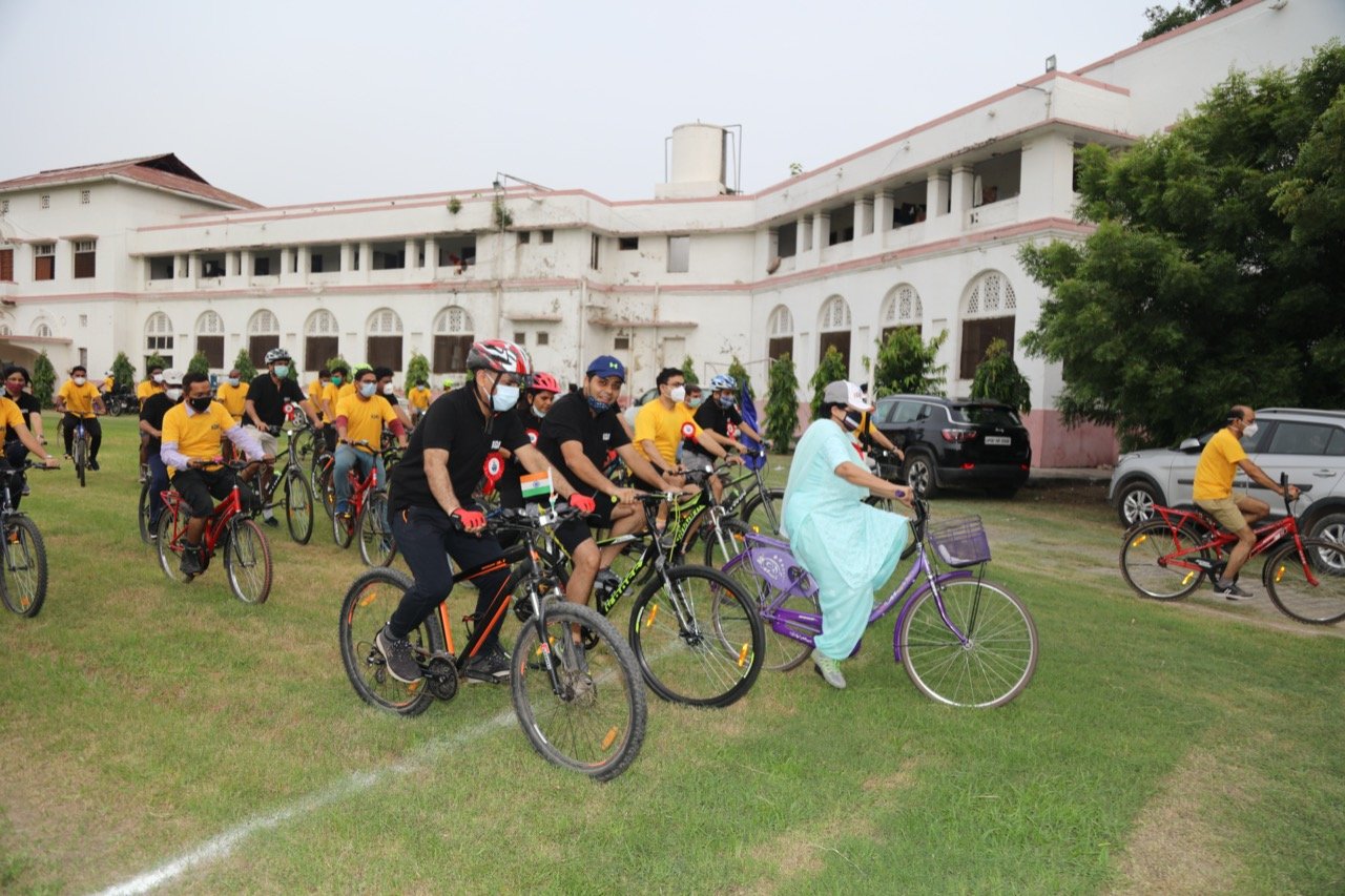 साईकिल रैली का शुभारम्भ कार्यक्रम के मुख्य अतिथि केजीएमयू कुलपति लेफ्टिनेंट जनरल बिपिन पुरी ने अपनी पत्नी श्रीमती अनीता पुरी के साथ झंडी दिखा कर किया गया।
